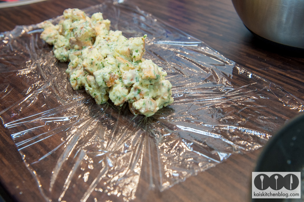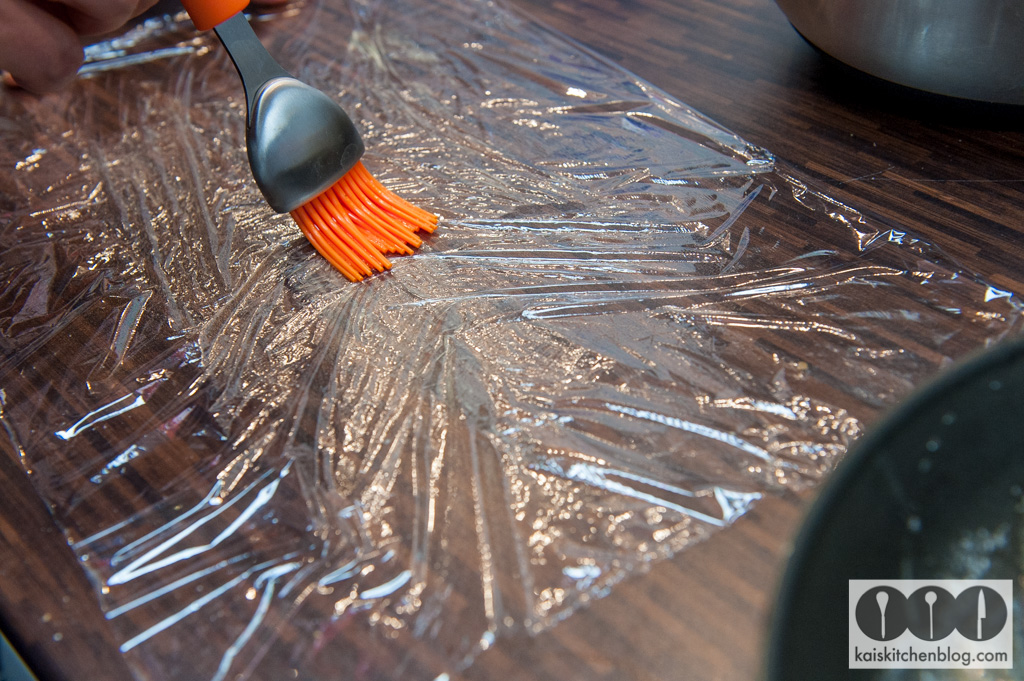 Küchenfolie in langen Steifen auslegen und mit etwas Butter bestreichen. Dann die Masse darauf verteilen. Die angegebene Menge sollte für vier Rollen reichen.