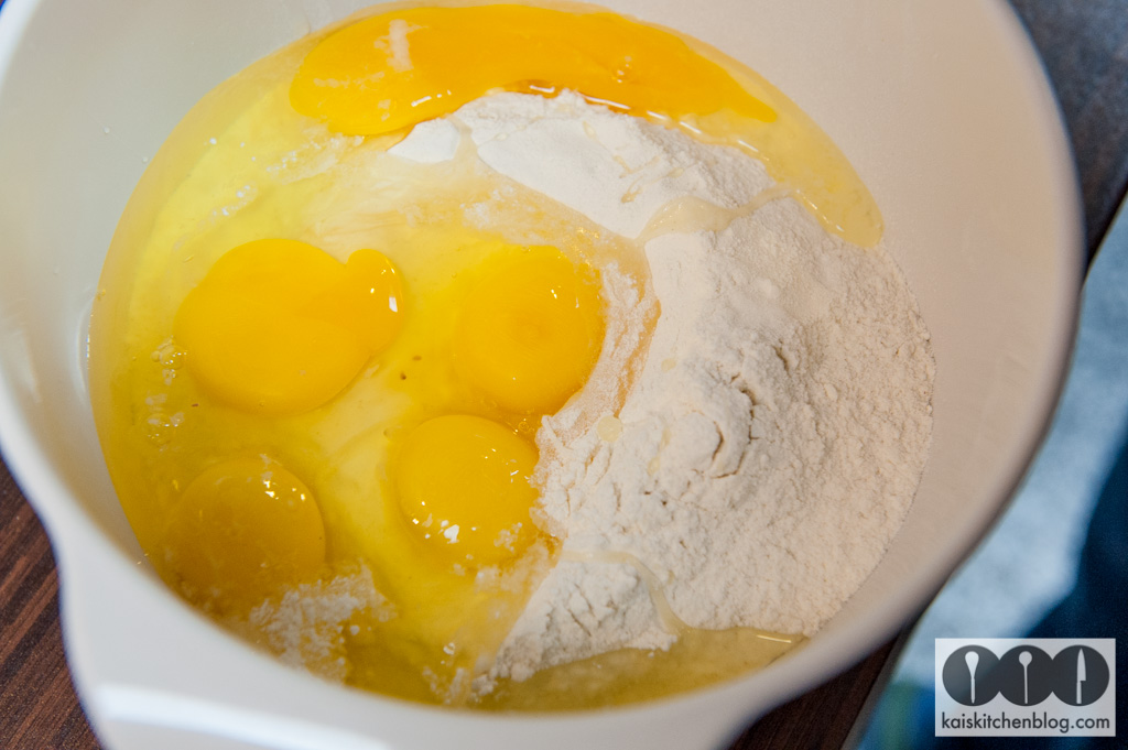 Die Mehl-Ei Mischung schließlich über die Brötchenwürfel geben und vorsichtig durch rühren, bis alles gleichmäßig verteilt ist.