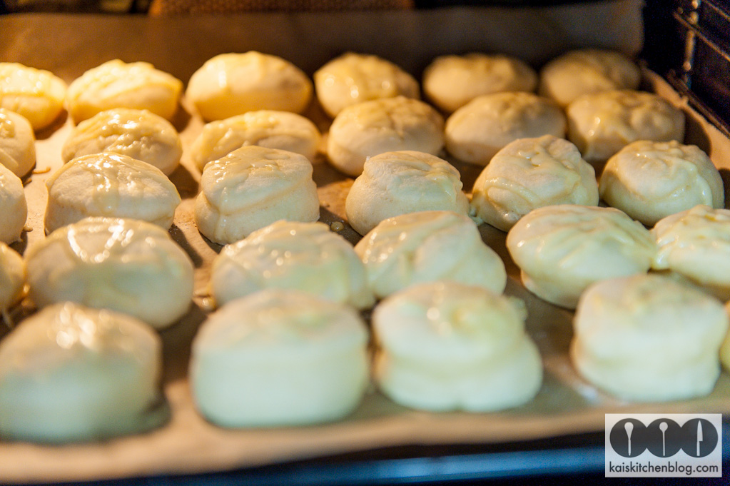 Take out the next day and roll out on floured worktop. It should be around 8-10mm thick. To punch out the pastries I always use a champagne glass – it just has the perfect size. Place the punched out pieces on a baking tray (you should put some baking paper). Please allow some space between the individual pieces.
